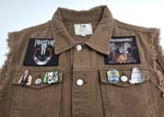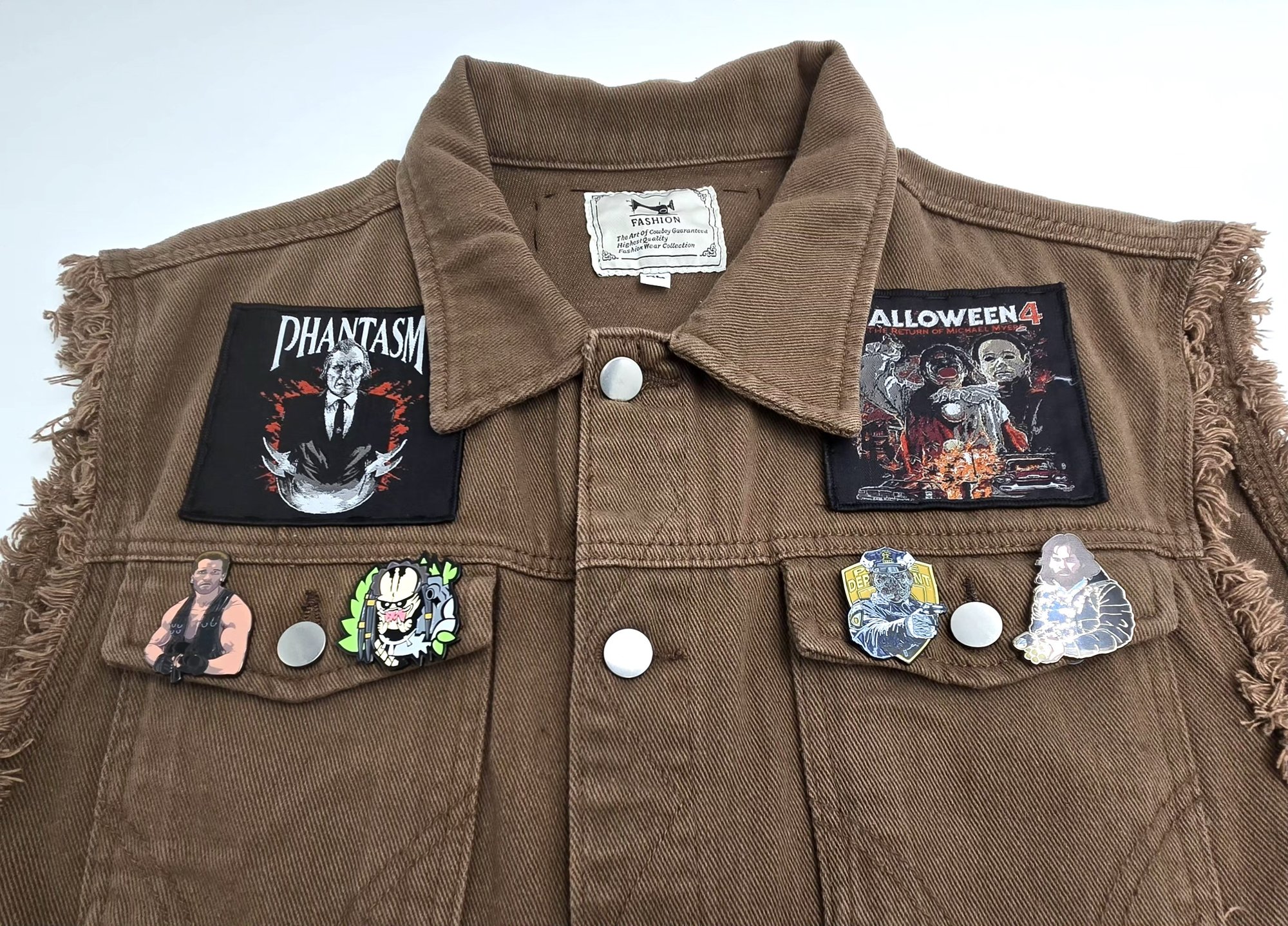Custom Horror One-of-a-Kind Men's Size XL Vest featuring 80's and 90's themed rare horror patches and some really cool unique enamel pins with locking backs so you don't lose your pins. All patches are hand sewn. *It takes several hours to design, collect the items and sew on each patch. These jackets/vests/bags are not mass produced and prices are indicative of the cost of each item (I don't get wholesale pricing), labor(sewing), shipping and tax there are no mark ups!!!*