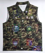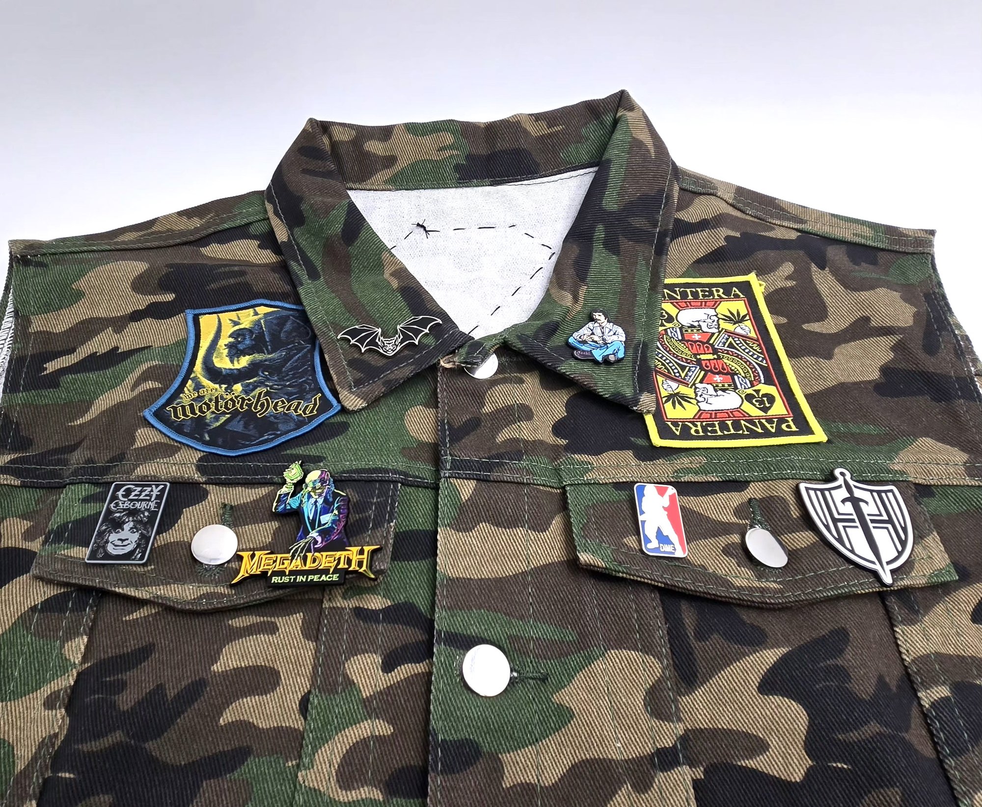 Custom One of a Kind "OzzFest" Camo Battle Vest Size Men's L most of these bands have all performed many times at OzzFest at some point with the exception of AC/DC and Ghost but still have the Ozzy connection. An amazing vest super rare patches most are sold out features riff Lord Iommi pin, Dimebag logo pin, Hanneman shield pin. All patches are hand sewn. *It takes several hours to design, collect the items and sew on each patch. These jackets/vests/bags are not mass produced and prices are indicative of the cost of each item (I don't get wholesale pricing), labor(sewing), shipping and tax, etc. there are no mark ups!!!*